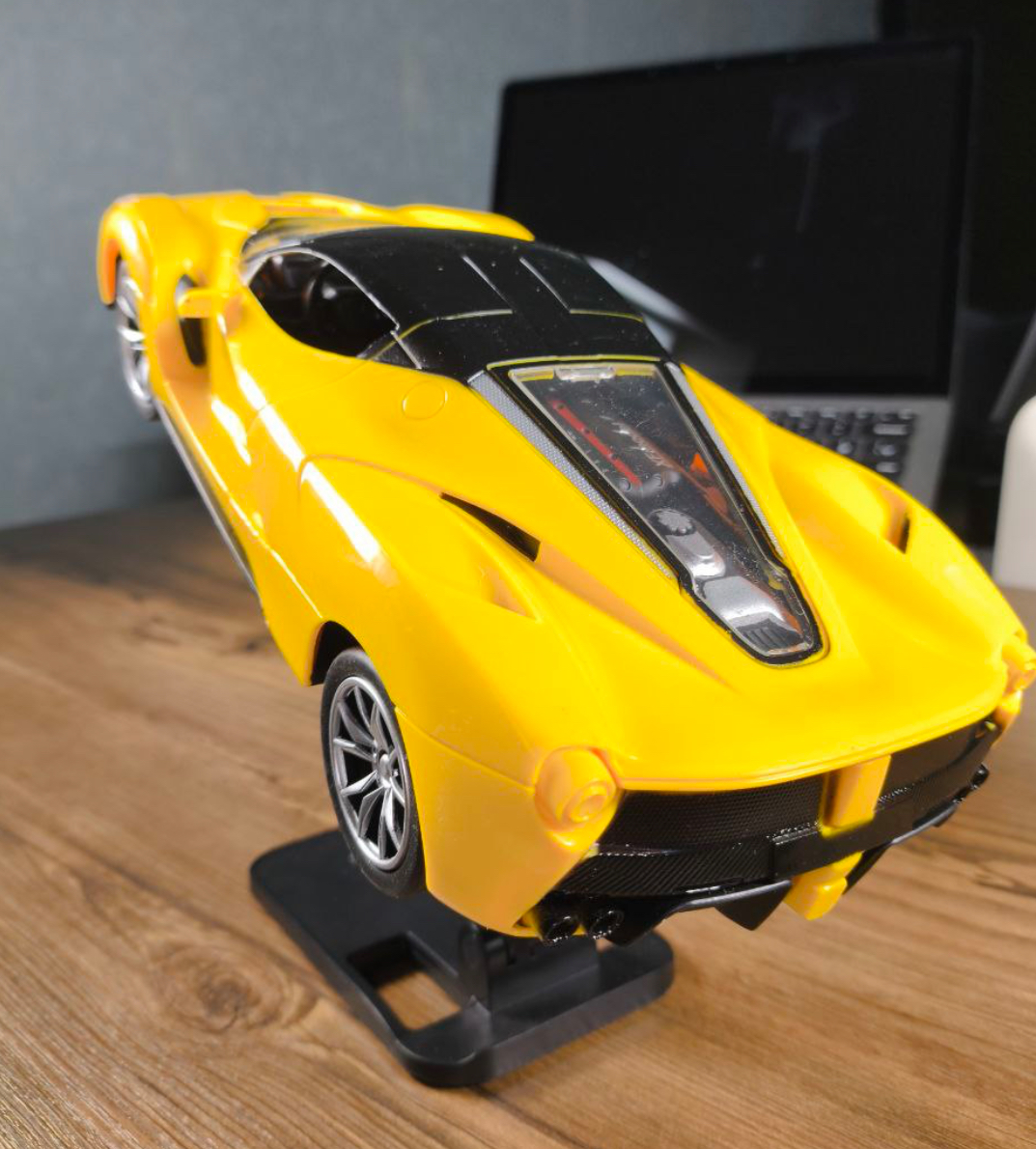 ماشین کنترلی فراری زرد ترکیبی از ظاهر نمایشگاهی و عملکرد مسابقه‌ای را ارائه می‌دهد.