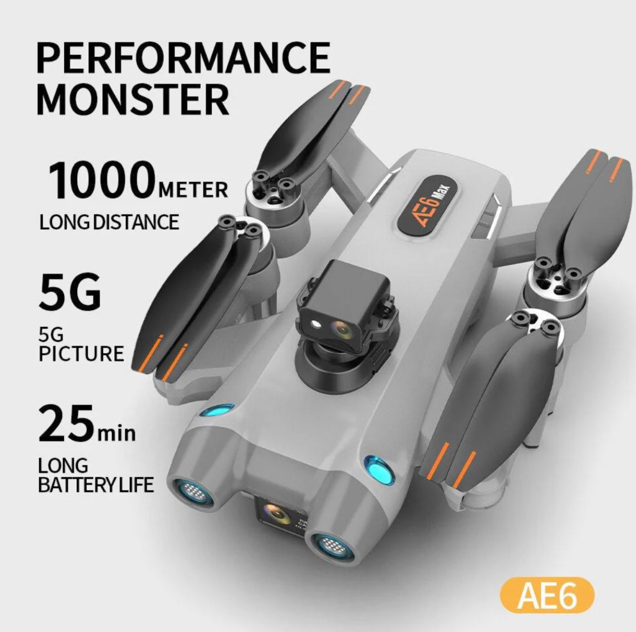 موتورهای براشلس AE6 MAX نیرو و پاسخگویی عالی دارند؛ شتابگیری نرم و کنترل دقیق روی مانورها مشاهده میکنید. پهپاد در بادهای سبک مسیر را حفظ میکند و کاربر حس تسلط کامل روی پرواز دارد. این ویژگی برای ثبت نماهای هوایی پویا حیاتی است.