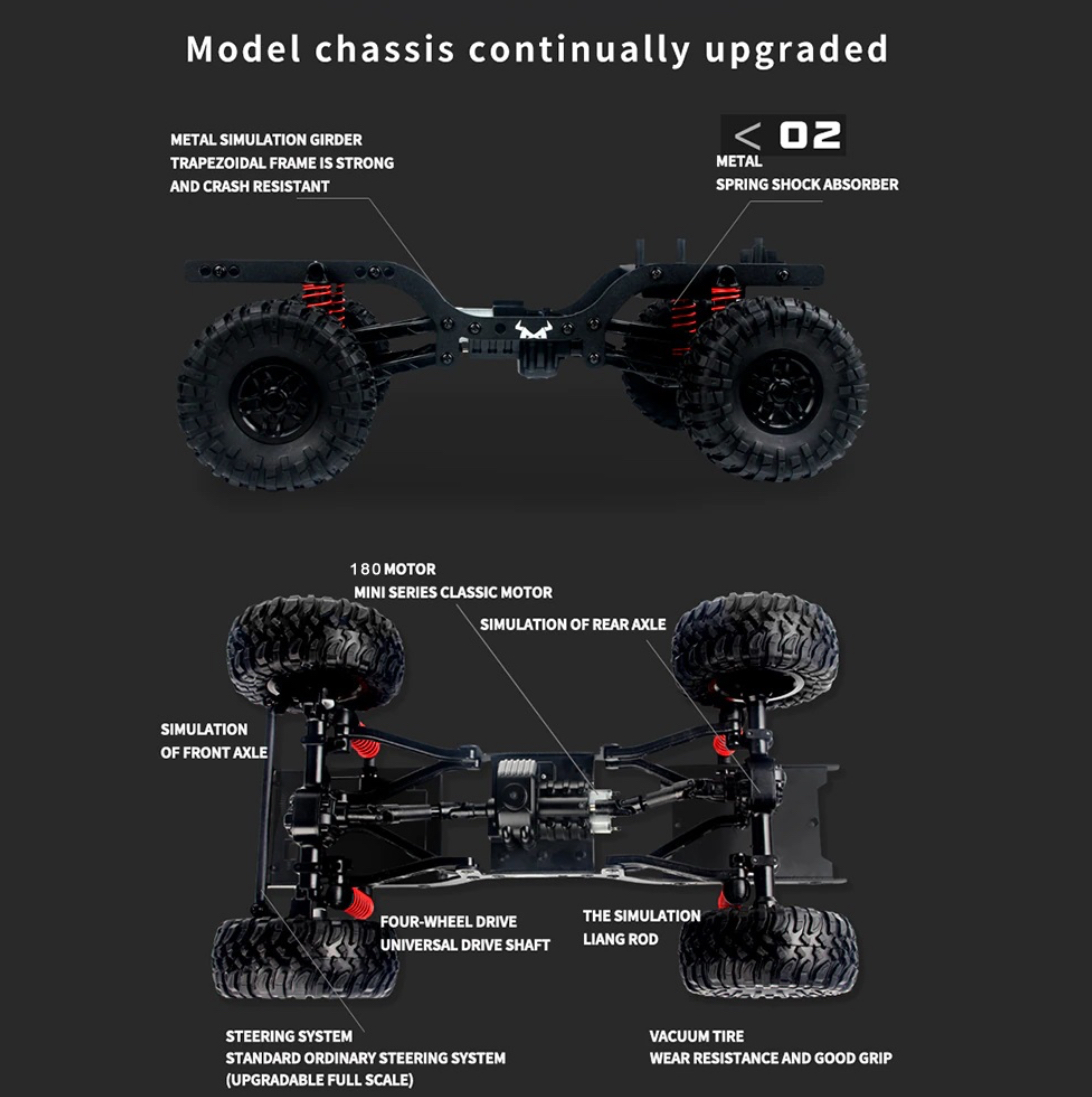 بدنه و شاسی Rock Crawler سبز از مواد مقاوم ساخته شدهاند که طول عمر بالایی را تضمین میکنند. این ویژگی باعث میشود ماشین در شرایط مختلف از جمله زمینهای سنگلاخ و مسیرهای دشوار، مقاومت عالی داشته باشد.